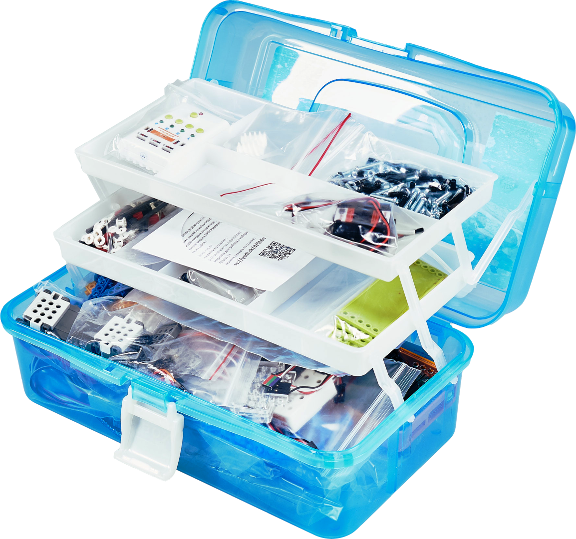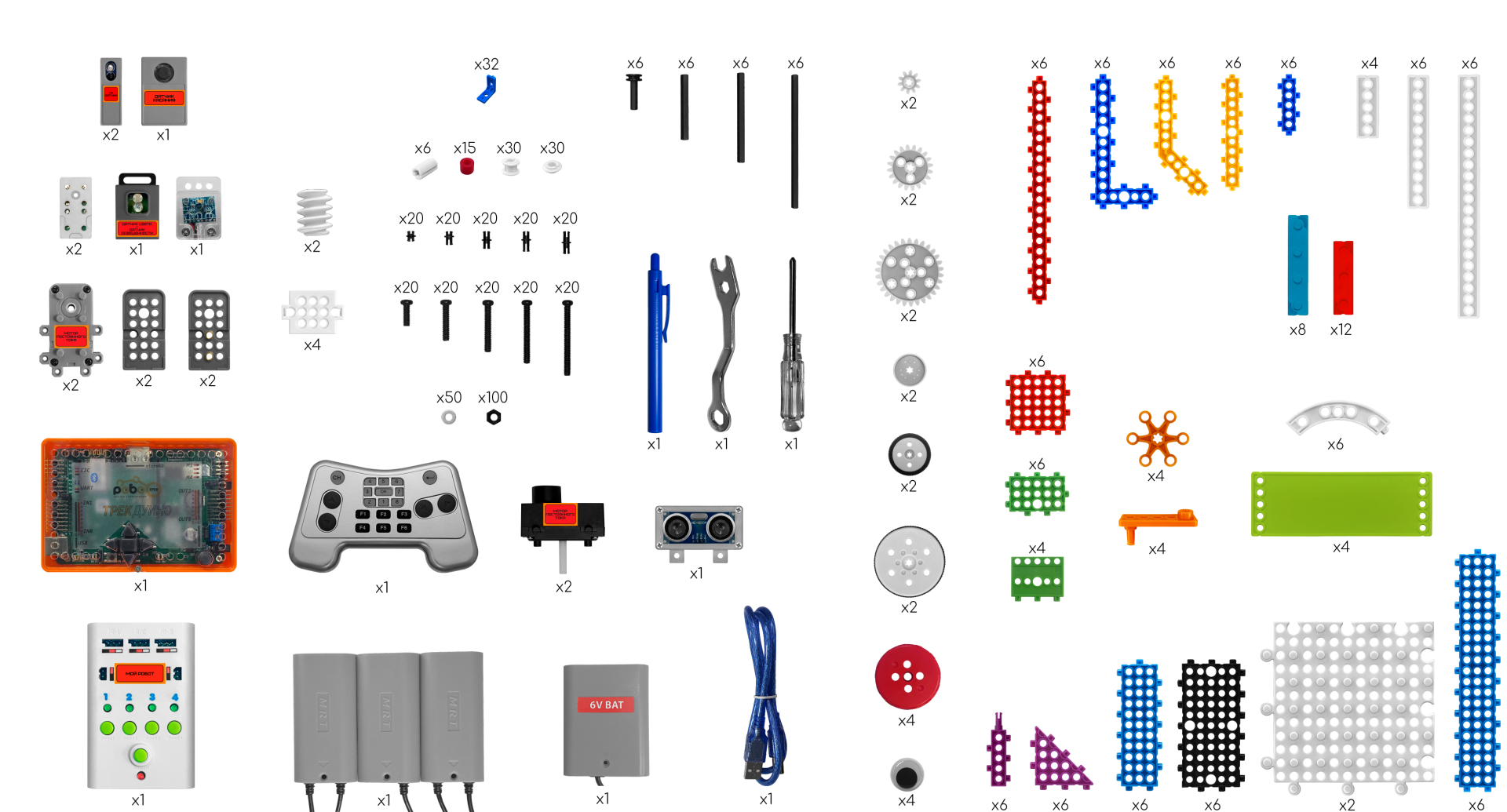 - набор различных датчиков (6 видов): 1 ультразвуковой датчик расстояния, 2 инфракрасных датчика, 1 датчик цвета и освещённости, 2 датчика касания, 2 внешних энкодера, 1 акселерометр/гироскоп;