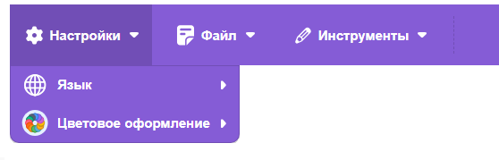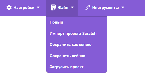 В разделе файл можно: 1. Создать новый проект. 2. Загрузить проект, созданный в среде Scratch. 3. Сохранить текущий проект в отдельный файл. 4. Сохранить текущий проект. 5. Загрузить ранее сохранный проект. |