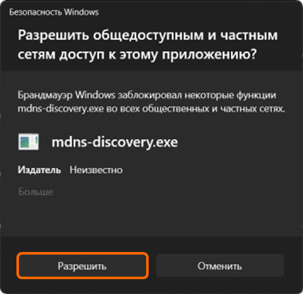 11. При необходимости после запуска в окне Безопасность Windows выберите «разрешить».