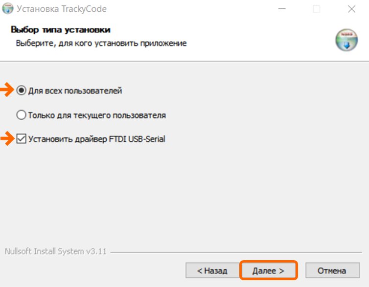 6. Выберите «Для всех пользователей». Выберите «Установить драйвер FTDI USB-Serial».