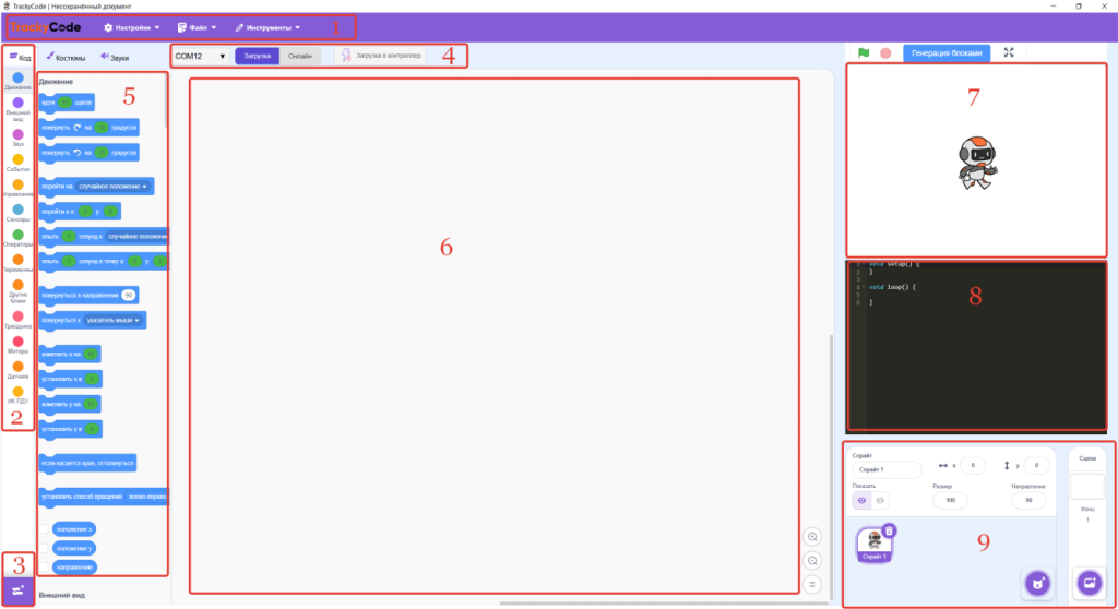 1 – Главное меню, 2 - Панель навигации по разделам блоков, 3 – Меню подключения дополнительных разделов, 4 – Панель работы с контроллером, 5 – Блоки команды, 6 – Рабочая область, 7 – Сцена, 8 – Текстовый редактор кода, 9 – Панель спрайтов и фонов.