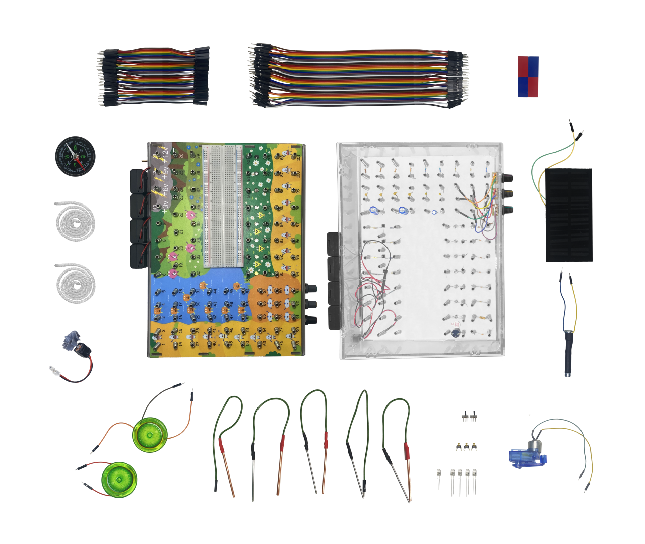 На занятиях, дополнительные компоненты используются для проведения наглядных опытов. Те устройства, которые в опытах подключаются к монтажному столику содержат выводы, которые подключаются к макетной плате или к пружинкам.