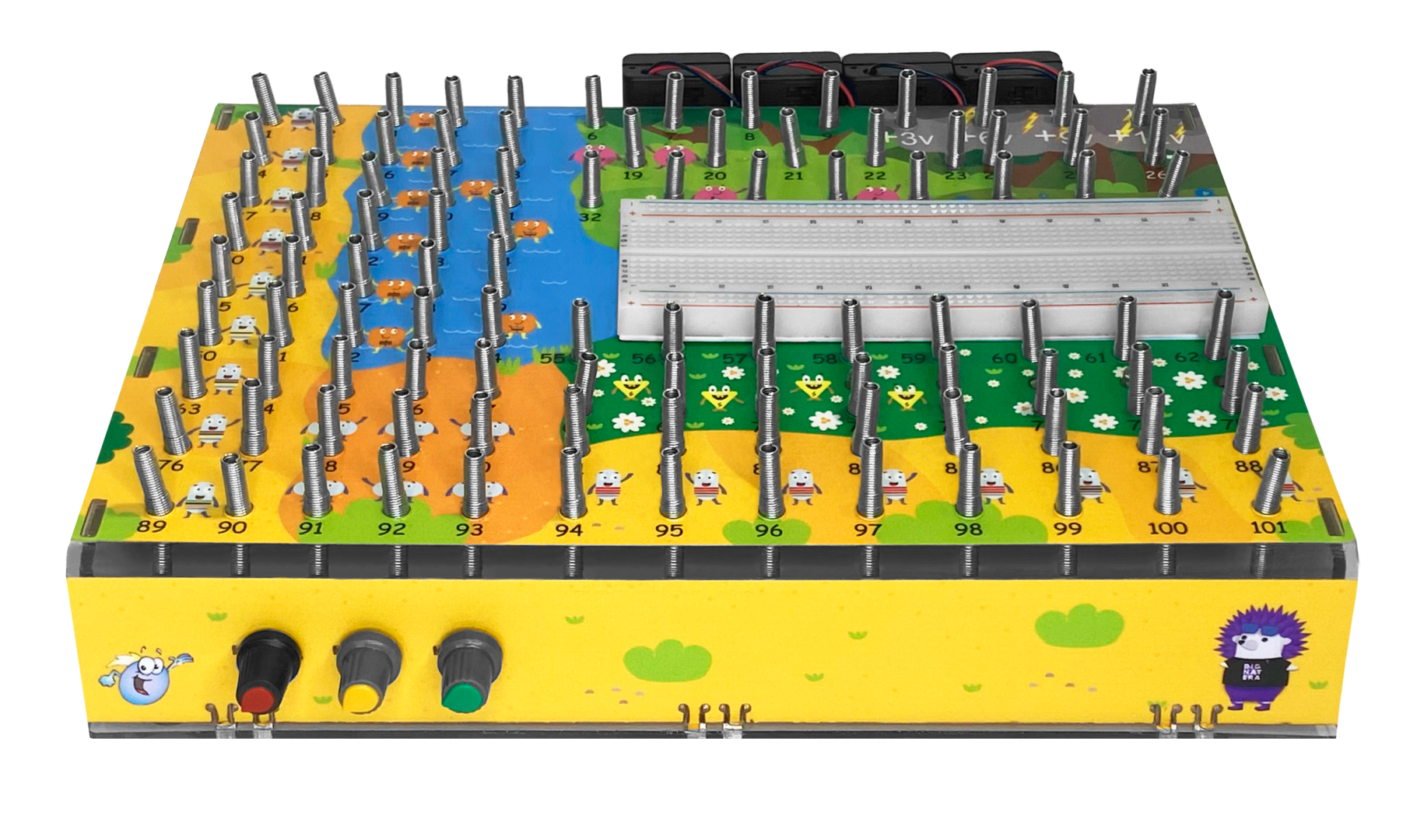 Игровой комплекс включает монтажный столик, предназначенный для упрощения сборки электронных схем. Он создает возможность собирать и тестировать их без пайки соединений. Для сборки схем необходимо просто отогнуть пружинку и вставить клемму провода, соединяя контакты. Такой способ соединения проводов абсолютно безопасен для ребенка, прост и понятен. Вся электронная база основных компонентов (резистор, конденсатор, транзистор, сопротивление и др.), используемая на монтажном столике, представлена в виде веселых человечков – помощников основного персонажа Ёжика Терри.