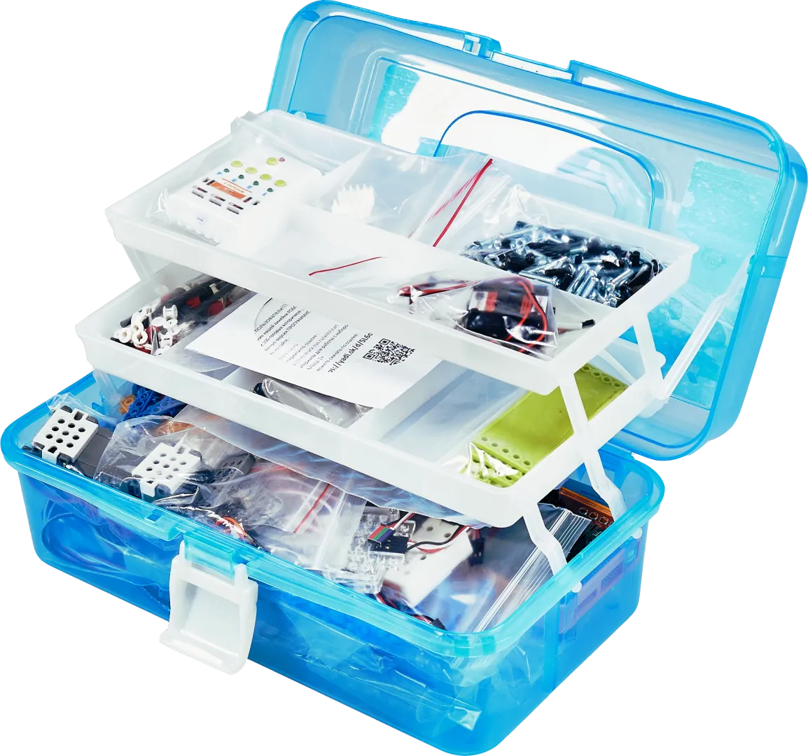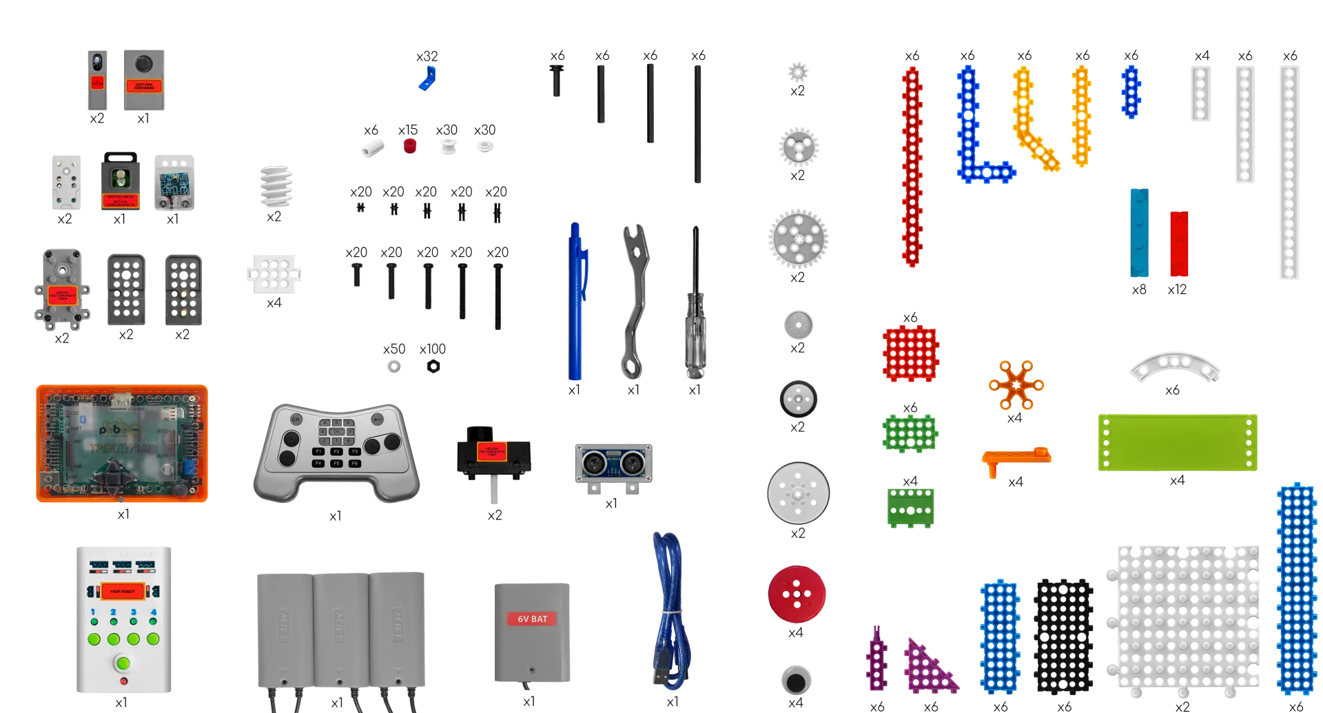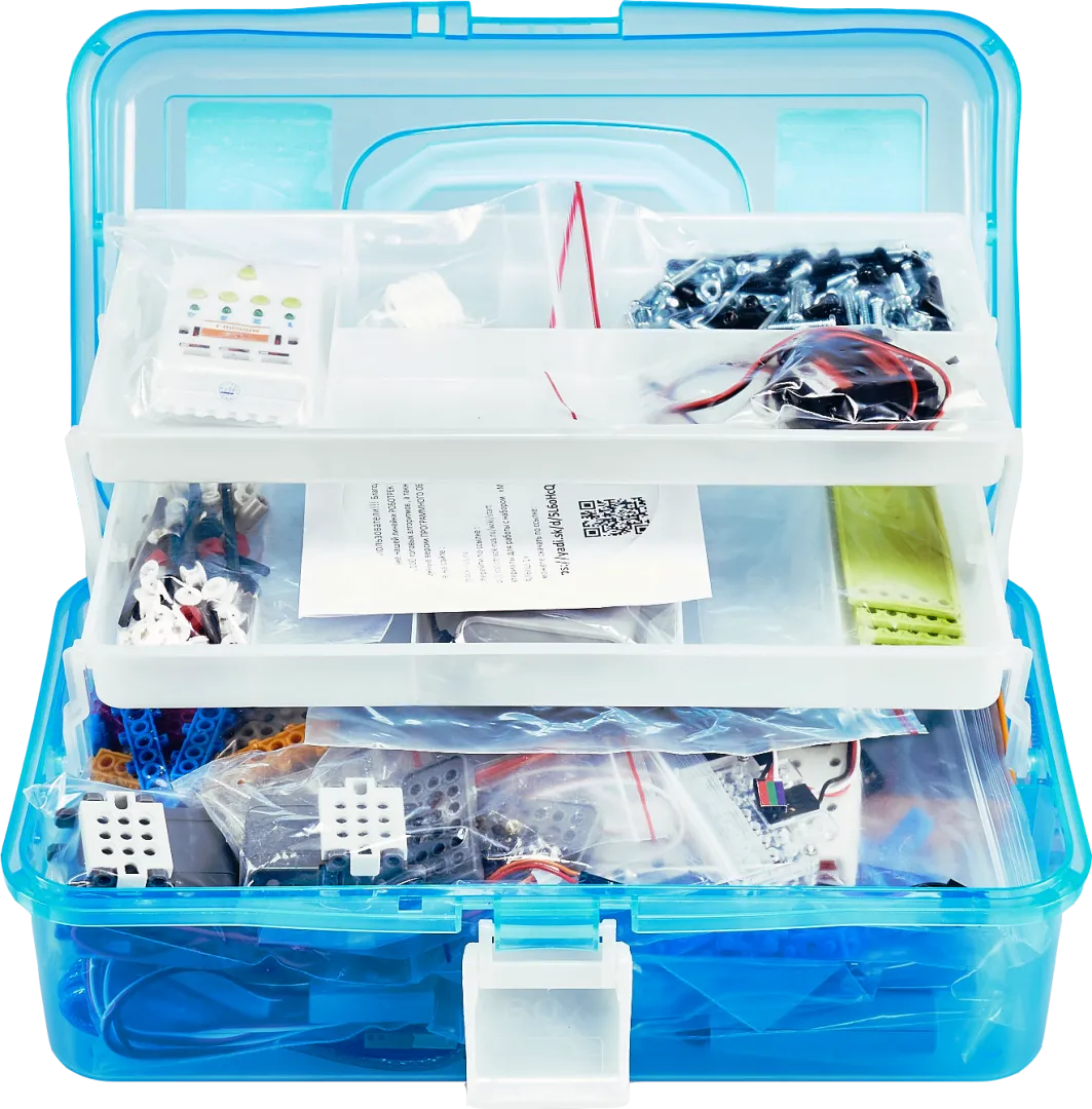 - набор различных датчиков (6 видов): 1 ультразвуковой датчик расстояния, 2 инфракрасных датчика, 1 датчик цвета и освещённости, 2 датчика касания, 2 внешних энкодера, 1 акселерометр/гироскоп;