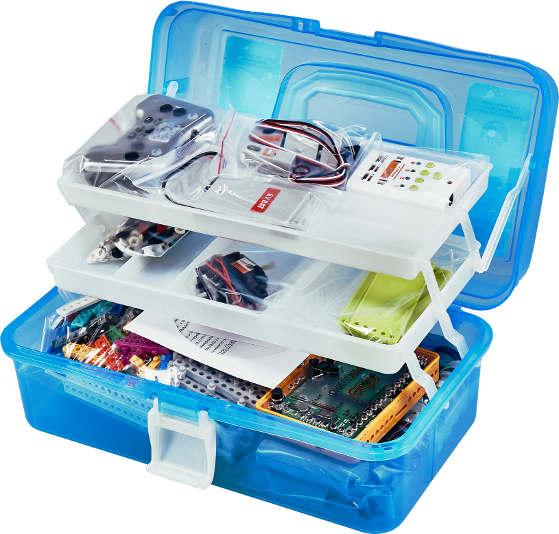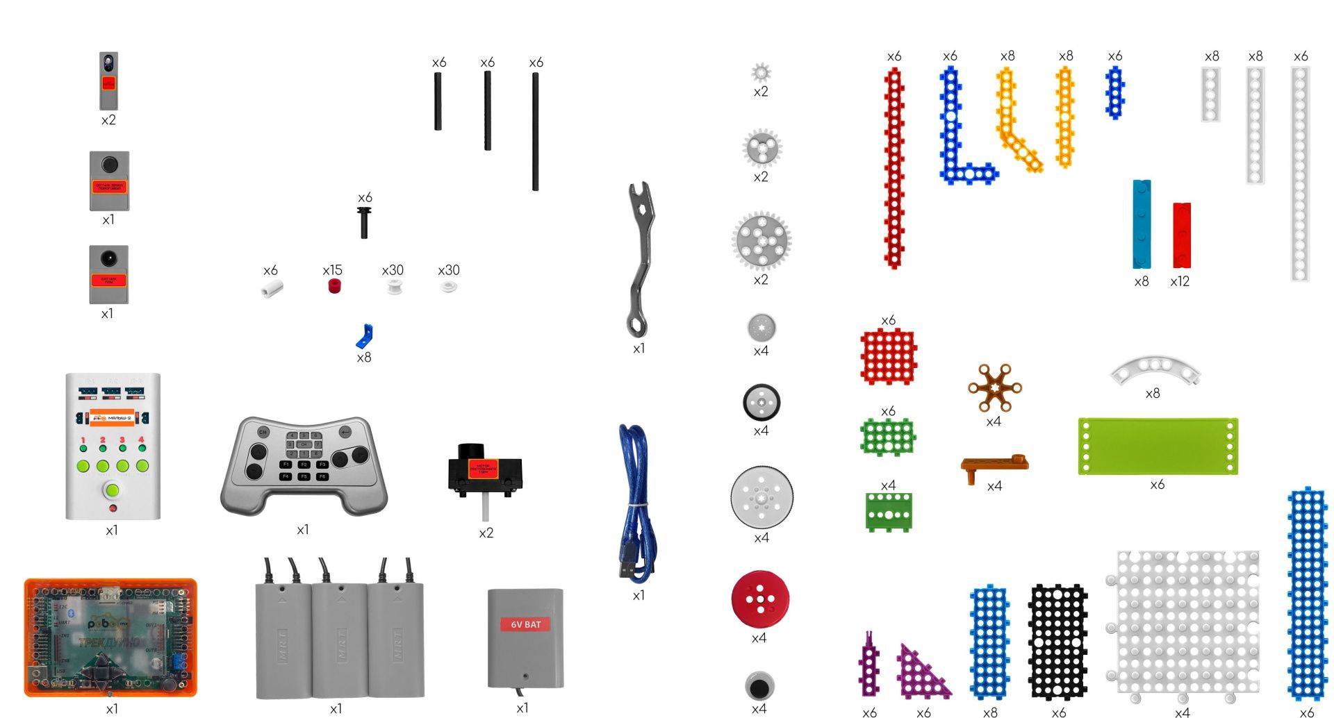 10. Пульт дистанционного управления. 11. Ссылка на ПО РОБОТРЕК, инструкции, 39 готовых файлов для прошивки платы ТРЕКДУИНО с алгоритмами для программирования роботов при условии наличия набора «Малыш проект» дополнительно 12. 3 вида рамок, крепление двигателя.